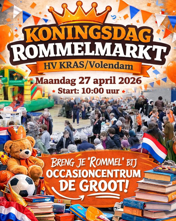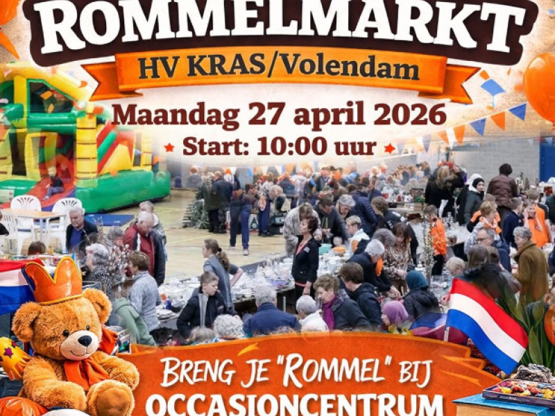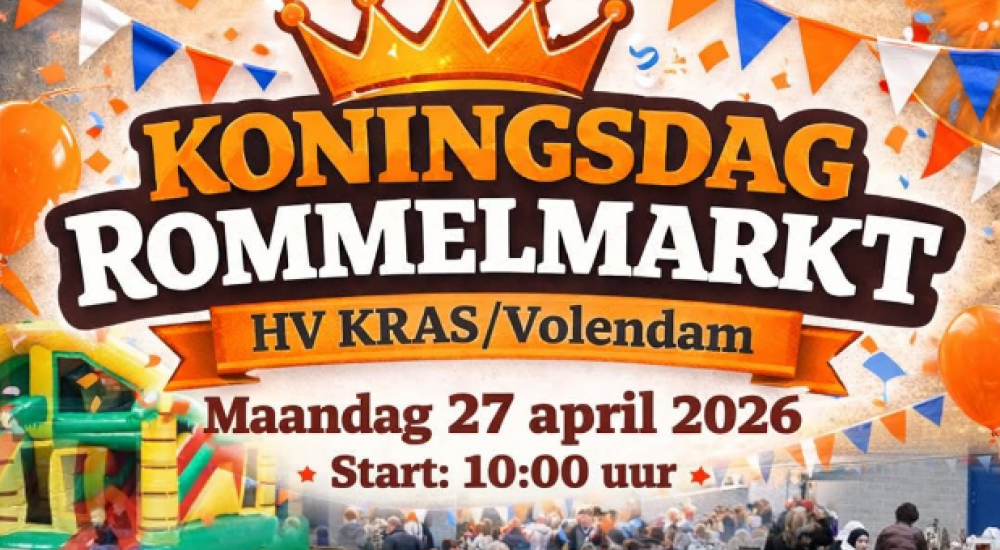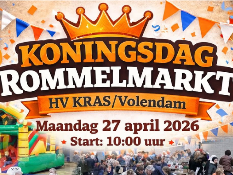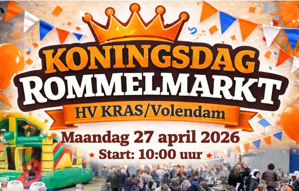 Op maandag 27 april 2026 organiseert HV KRAS/Volendam voor de 43e keer de gezellige en bekende Koningsdag-rommelmarkt in Sporthal Opperdam.