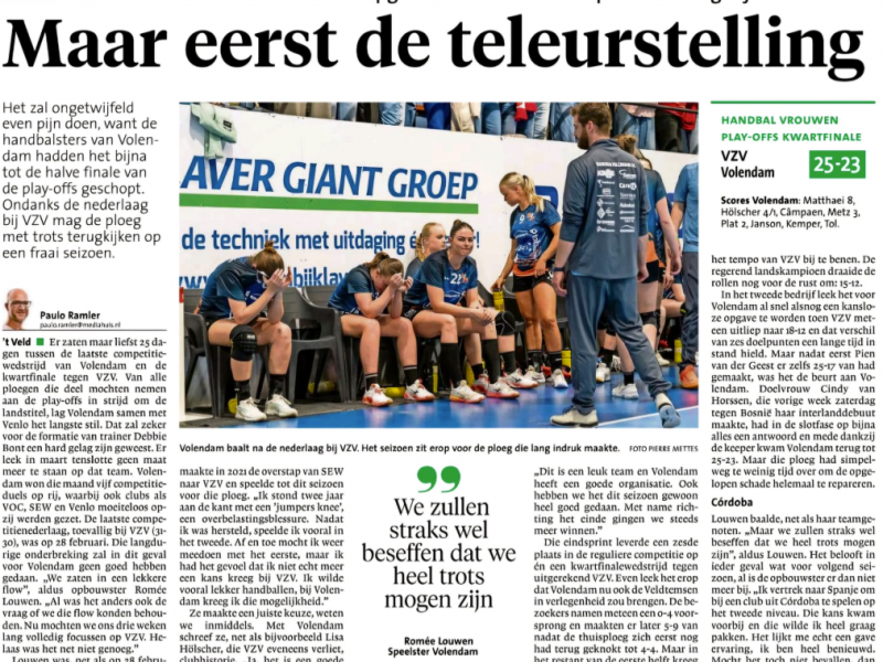 Het seizoen van Dames 1 van HV KRAS/Volendam is ten einde gekomen, en dat gebeurde op pijnlijke wijze. In ’t Veld werd in de kwartfinale van de play-offs nipt verloren van VZV (25-23). Daarmee kwam er abrupt een einde aan een seizoen waarin de ploeg lange tijd indruk maakte en zelfs dicht bij een plek in de halve finale was.
