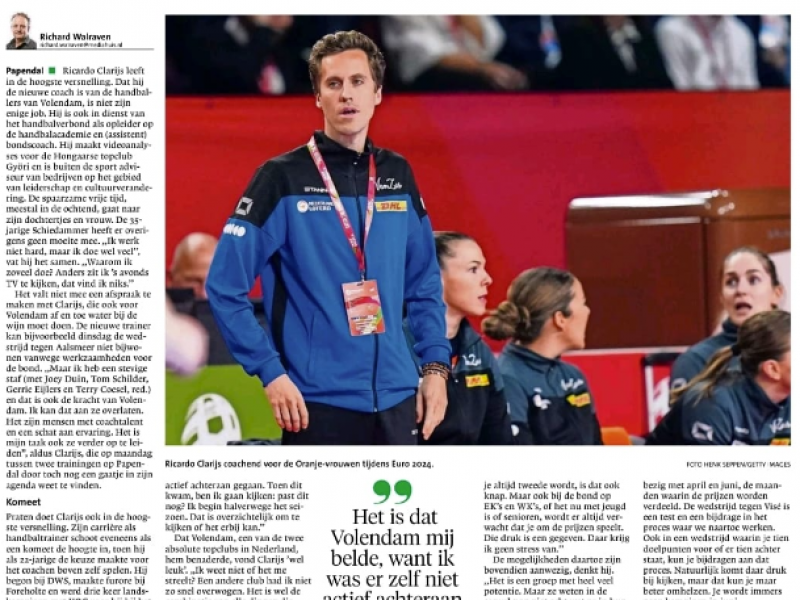 De afgelopen dagen verscheen in de media uitgebreid aandacht voor de start van Ricardo Clarijs als nieuwe hoofdcoach van HV KRAS/Volendam Heren. In verschillende interviews schetst Clarijs zijn visie op de ploeg, de cultuur binnen het team en de stappen die nodig zijn om structureel door te groeien, ga naar www.noordhollandsdagblad.nl om de berichten te lezen