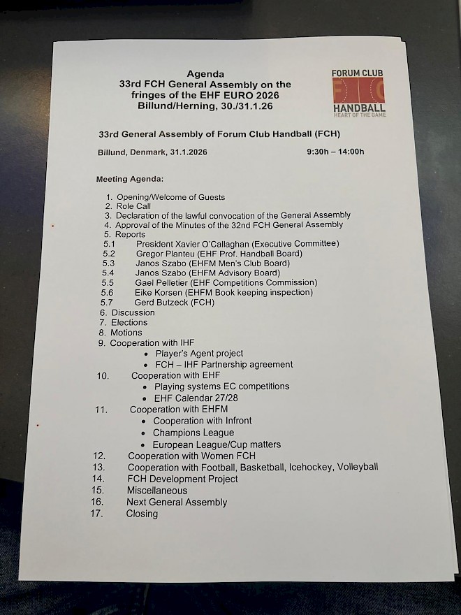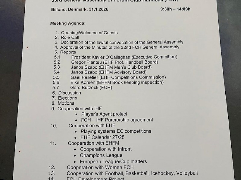 Tijdens de General Assembly kwamen vertegenwoordigers van toonaangevende Europese handbalclubs bijeen om te spreken over actuele en toekomstige ontwikkelingen binnen het internationale clubhandbal. Op de agenda stonden onder meer de samenwerking met de EHF en IHF, de internationale speelkalenders, Europese competities (Champions League en European League), governance-vraagstukken en diverse ontwikkelprojecten van FCH.