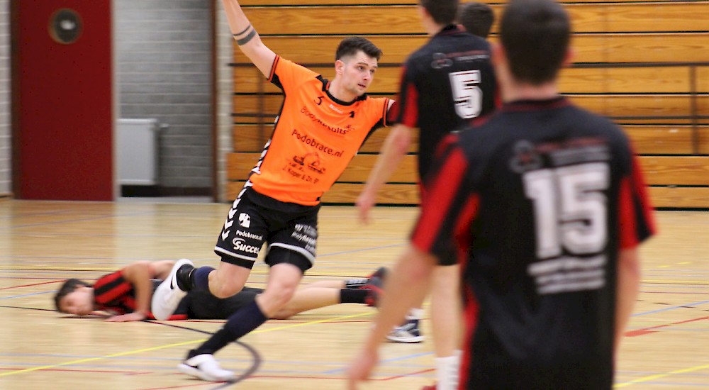 In de tweede helft was het Tim Jonk die het doel verdedigde en die liet zich gelijk gelden. Via een aantal goede verdedigende acties, kon hij een paar mooie redding verrichtten, die leidde tot een aantal break out goals van Stefan Schilder. De thuisploeg pakte wederom een kleine voorsprong van 3 punten bij 21 – 18. Jong BodyResults/Volendam wist deze reeks echter niet door te zetten en al snel kwam de uitploeg weer langszij bij 22 – 22. Keerpunt in de wedstrijd was de rode kaart voor een van de schutters van Olympia. Volendam wist in deze fase weer een voorsprong van 3 punten te pakken. Volendam kwam op 27 - 24. Vooral rechteropbouw Marnix Roos wist het net van de tegenpartij gemakkelijk te vinden en zorgde voor een aantal spectaculaire doelpunten. Volendam bouwde de voorsprong uit en deze kwam vervolgens niet meer in gevaar. Na een wisselvallige wedstrijd wist Jong BodyResults/Volendam de twee punten uiteindelijk in de Opperdam te houden.