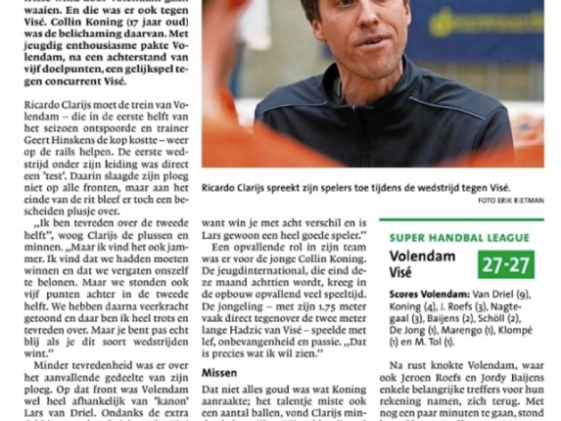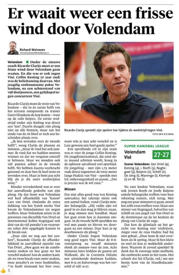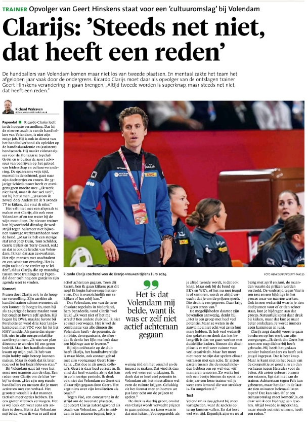 De afgelopen dagen verscheen in de media uitgebreid aandacht voor de start van Ricardo Clarijs als nieuwe hoofdcoach van HV KRAS/Volendam Heren. In verschillende interviews schetst Clarijs zijn visie op de ploeg, de cultuur binnen het team en de stappen die nodig zijn om structureel door te groeien, ga naar www.noordhollandsdagblad.nl om de berichten te lezen